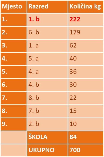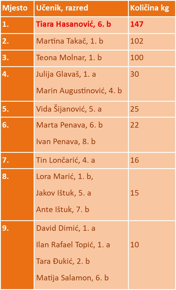 Uključimo se sljedećega mjeseca i pokažimo svoju ekološku svijest. Zahvaljujemo onima koji su i ovoga mjeseca bili vrijedni, a čestitamo pobjednicima – 1. b razredu i Tiari Hasanović iz 6. b. Ovoga puta u tablici učenika su svi učenici koji su sudjelovali.