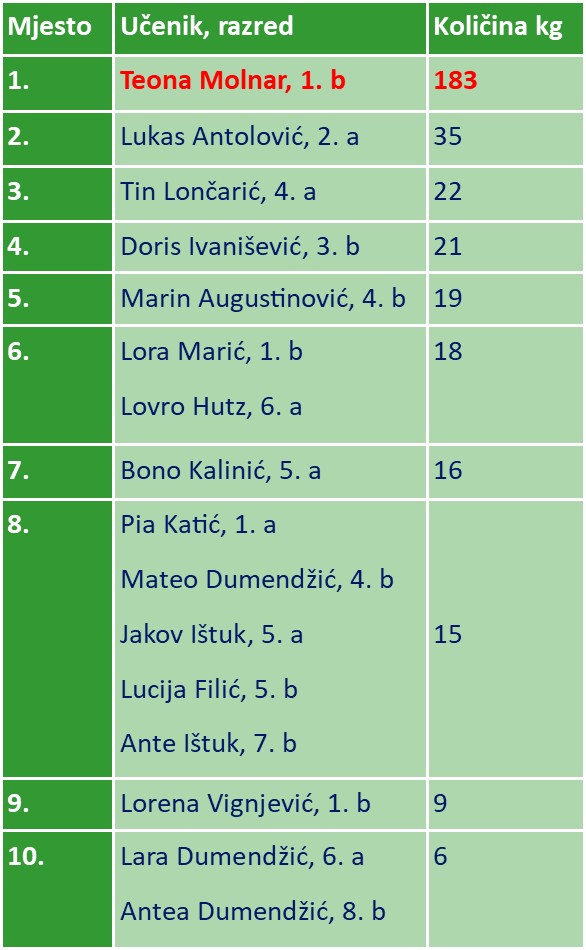 Čestitamo Teoni i 1. b razredu, a svima koji su sudjelovali zahvaljujemo na trudu. Bilo bi još bolje da se akciji priključilo više učenika i roditelja.
