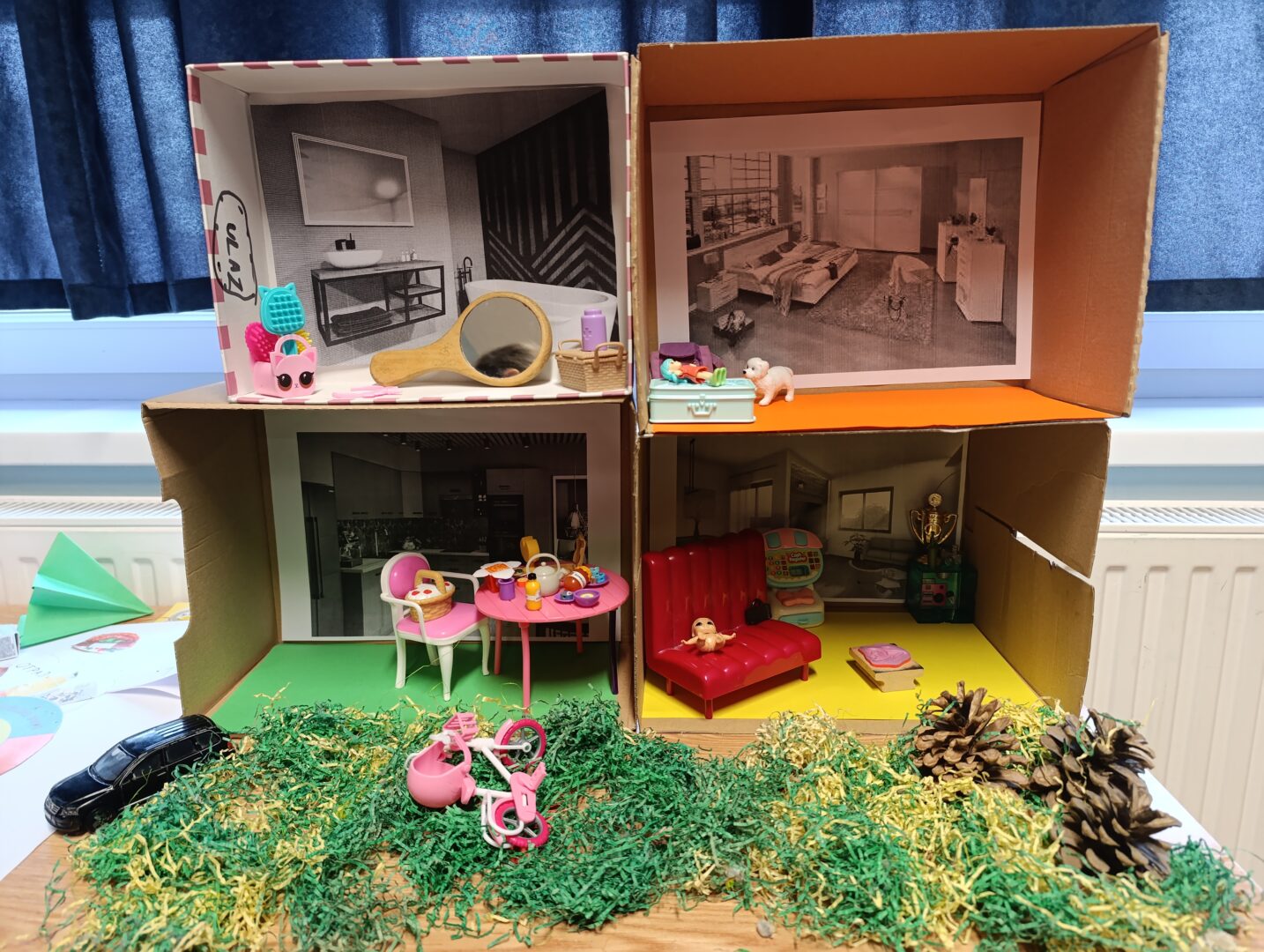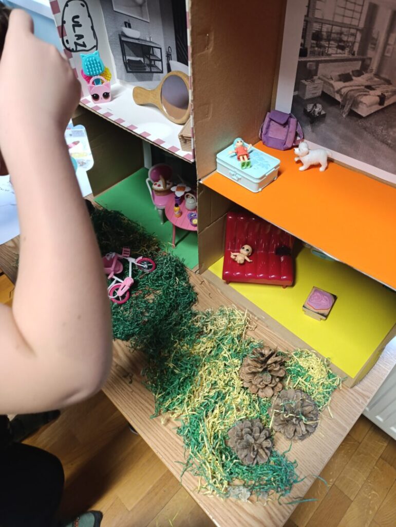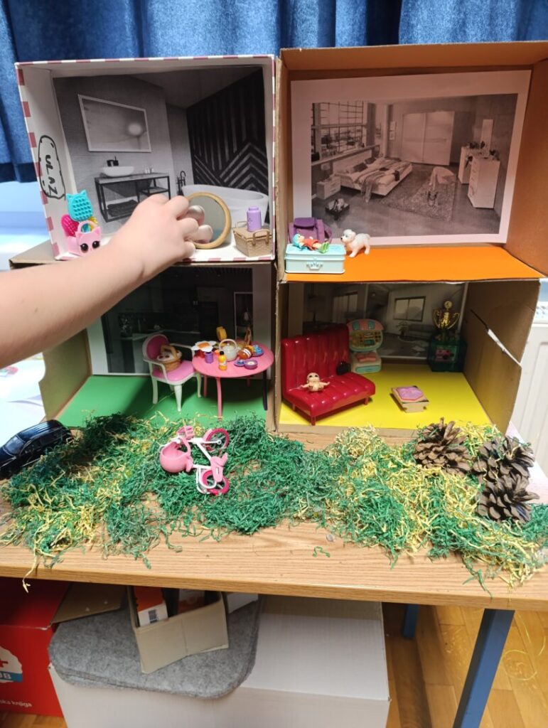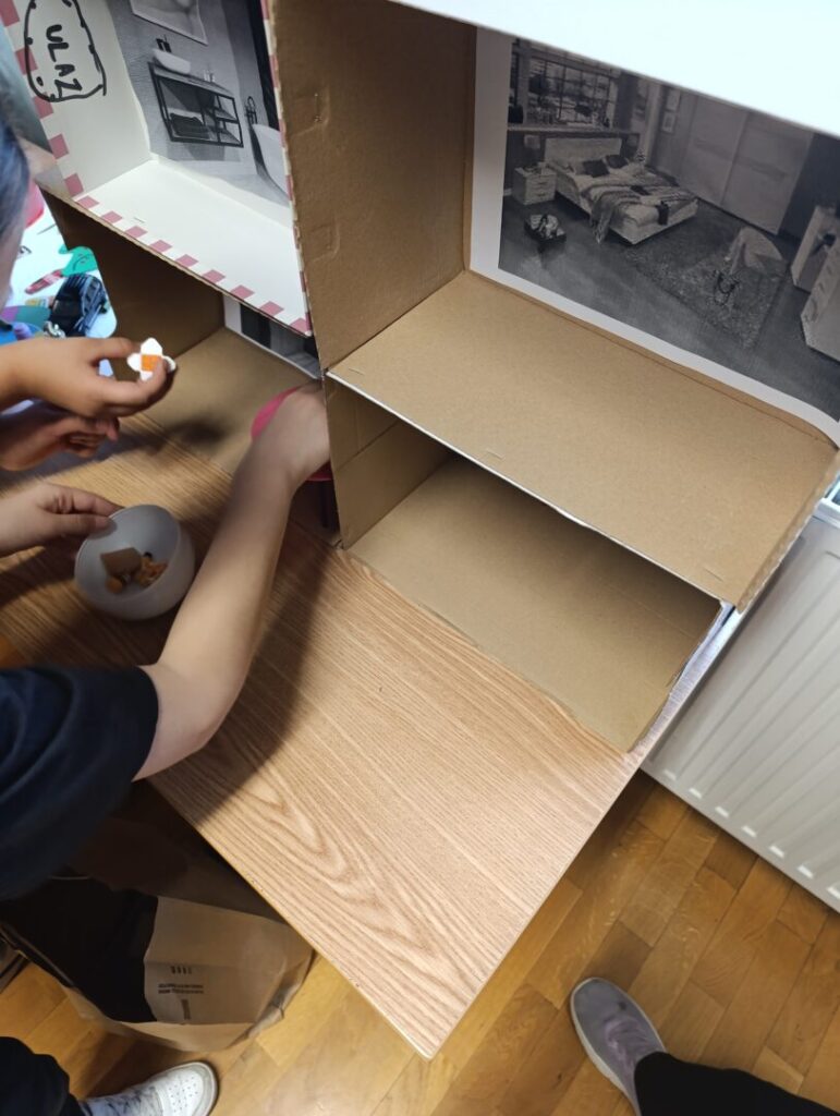 Napravili smo kućicu od kartona s prostorijama i namještajem. Ujedno smo ponovili vokabular i odgovarali na pitanja gdje se što nalazi koristeći prijedloge mjesta. Sljedeći sat smo na isti način usmeno odgovarali.